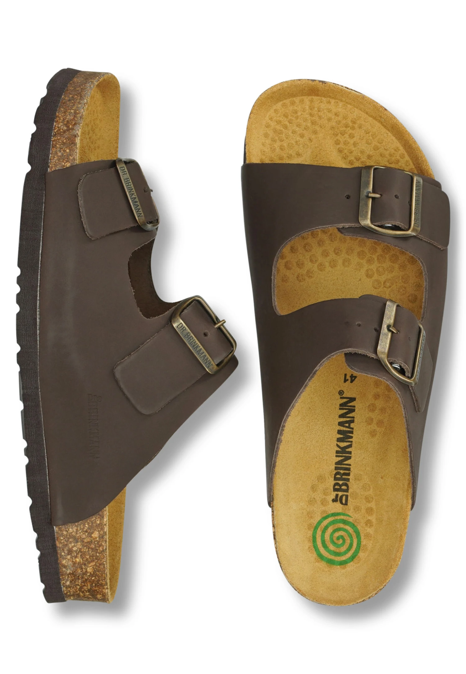 Diese neuen Klassiker in weiter Form werden Sie garantiert begeistern! Die Herren Pantoletten sind die perfekten Schuhe, wenn Sie hochwertige Sandalen suchen, die auch für den etwas breiteren Fuß geeignet sind. Mit den zwei verstellbaren Riemen können Sie die Passform mitbestimmen und haben es immer bequem. Dank der atmungsaktiven Decksohle aus Leder und den stimulierenden Massagenoppen ist die Pantolette besonders gut zum Barfußtragen geeignet. Innen- und Obermaterial bestehen ebenfalls aus Echtleder, sodass Ihnen ein angenehmes Fußklima und beste Qualität geboten wird. Die Herren Pantoletten zeigen sich in einem edlen Kastanienbraun mit farblich abgestimmten Schnallen.