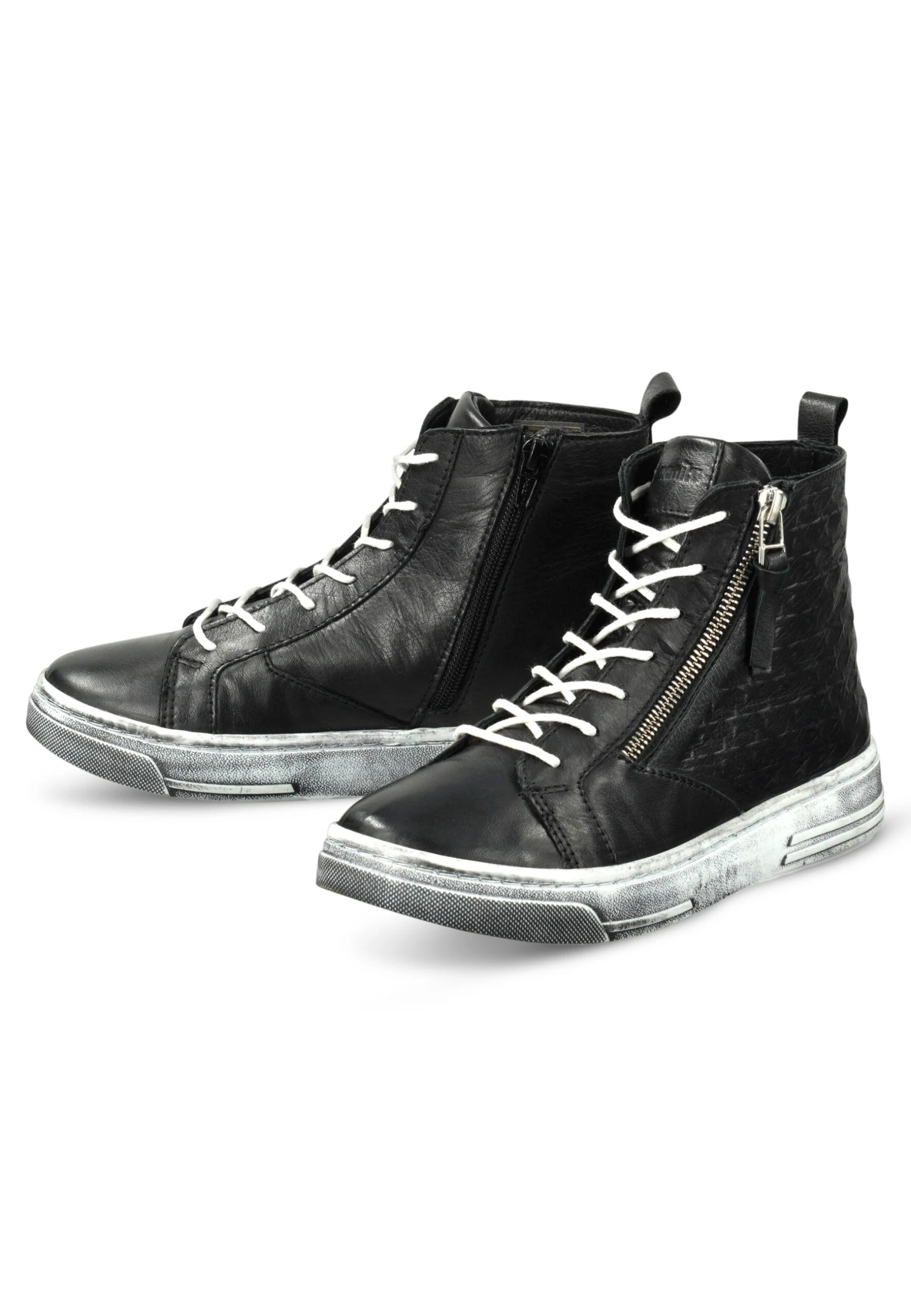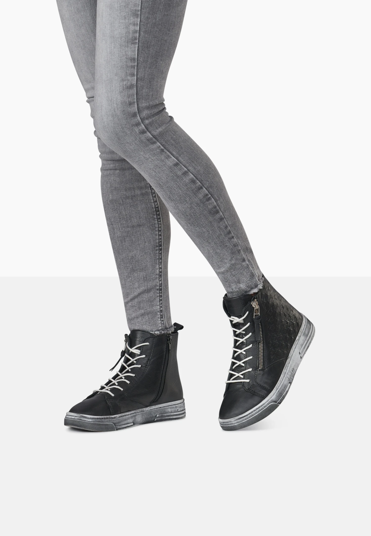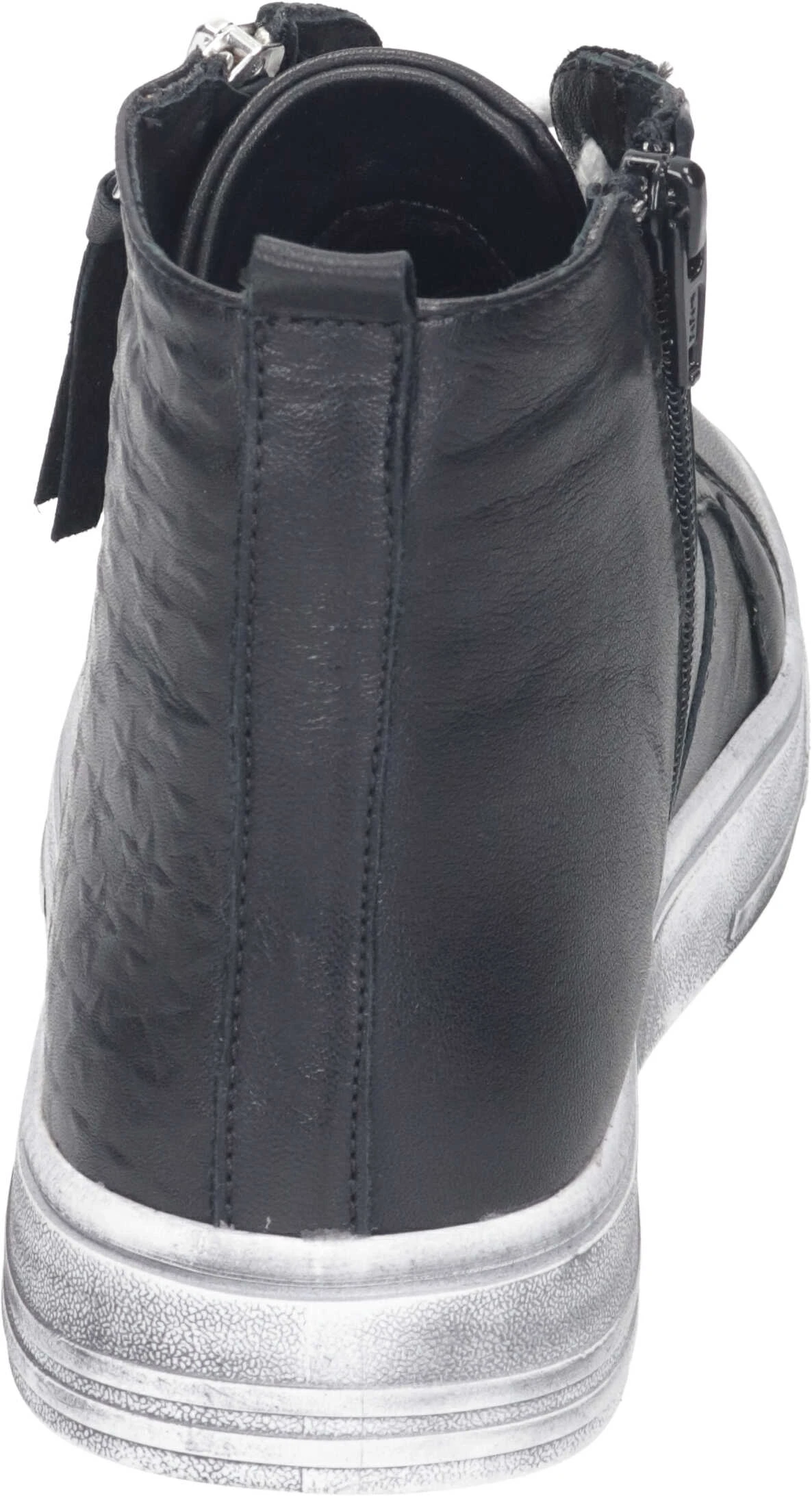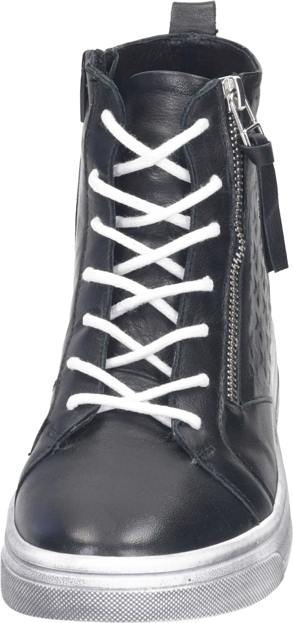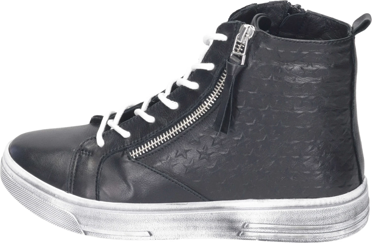 Hier haben wir eine sportliche Damen Stiefelette in schwarz, die im High Sneaker Style mit raffinierten Details auftritt. Die Lederprägungen in Sternform und der dekorative Reißverschluss geben dem Schuh das besondere Etwas. Durch die breite Laufsohle im Used-Look ist der Schuh nicht nur robust, sondern wirkt zudem authentisch und charismatisch. Die Sohle der Schnürstiefelette ist einfach herausnehmbar und kann durch eine lose Einlage ersetzt werden. Entdecken Sie auch die vielfältigen Farbvarianten und kreieren Sie den Look, der perfekt zu Ihnen passt!