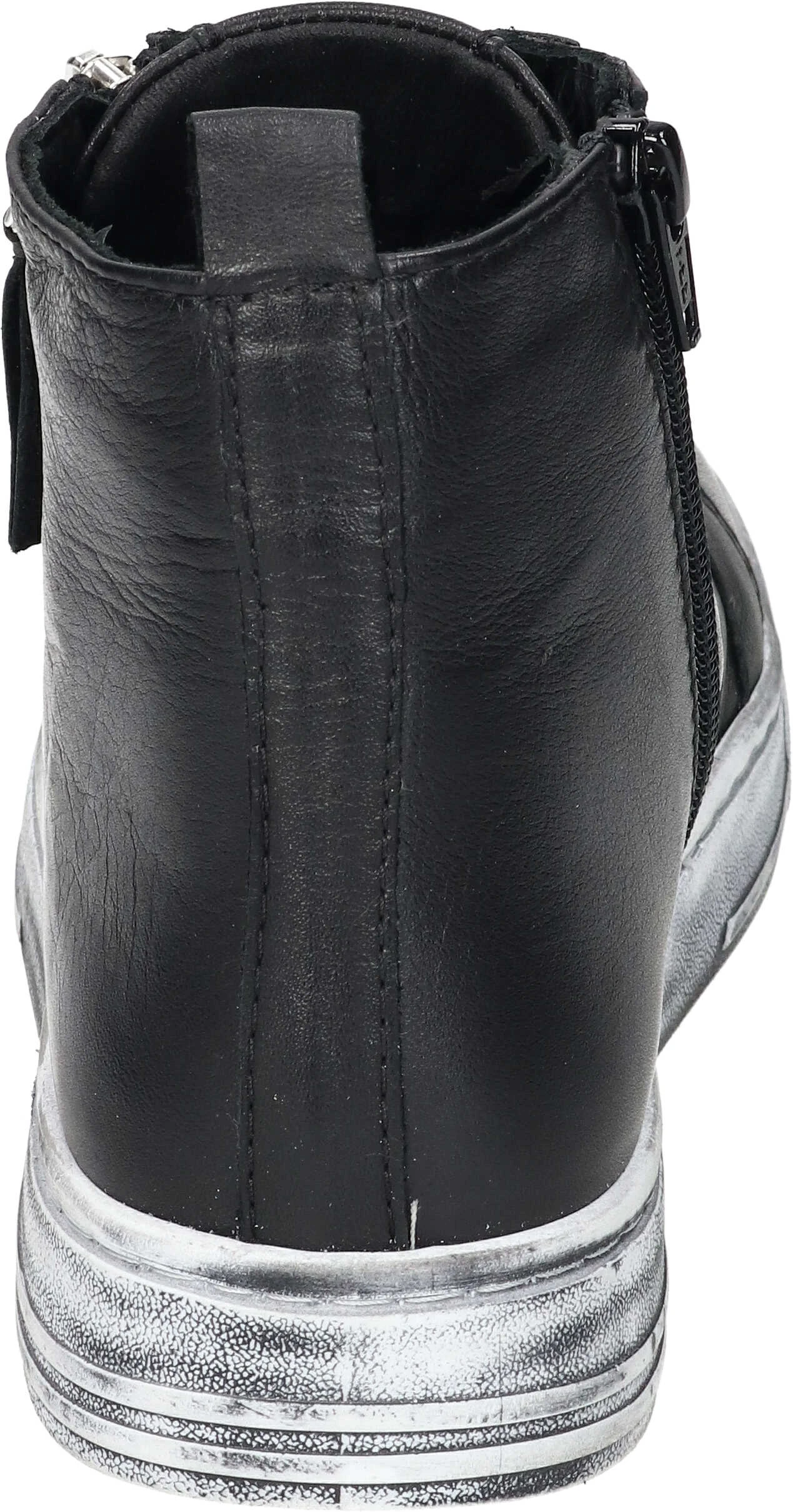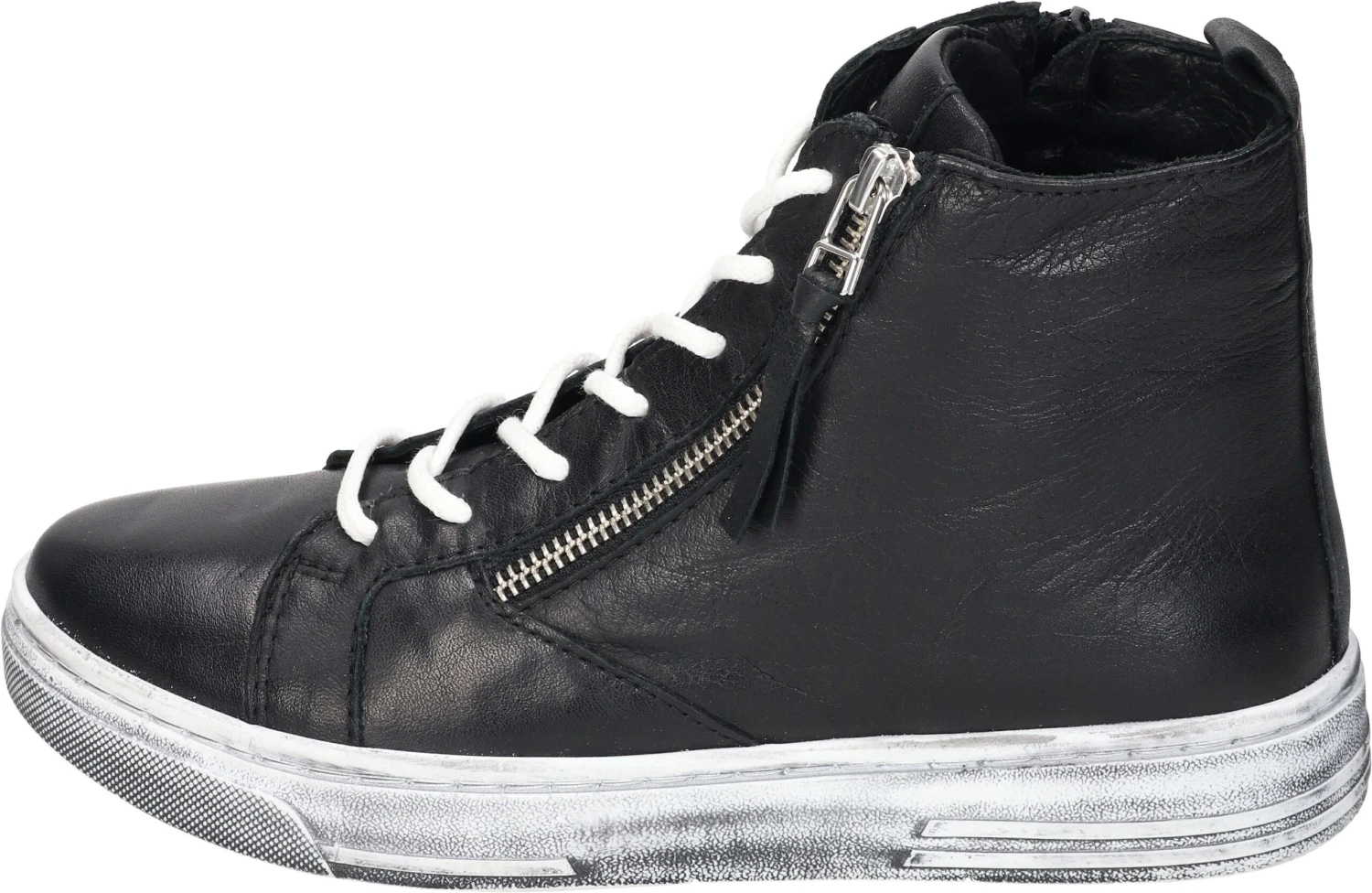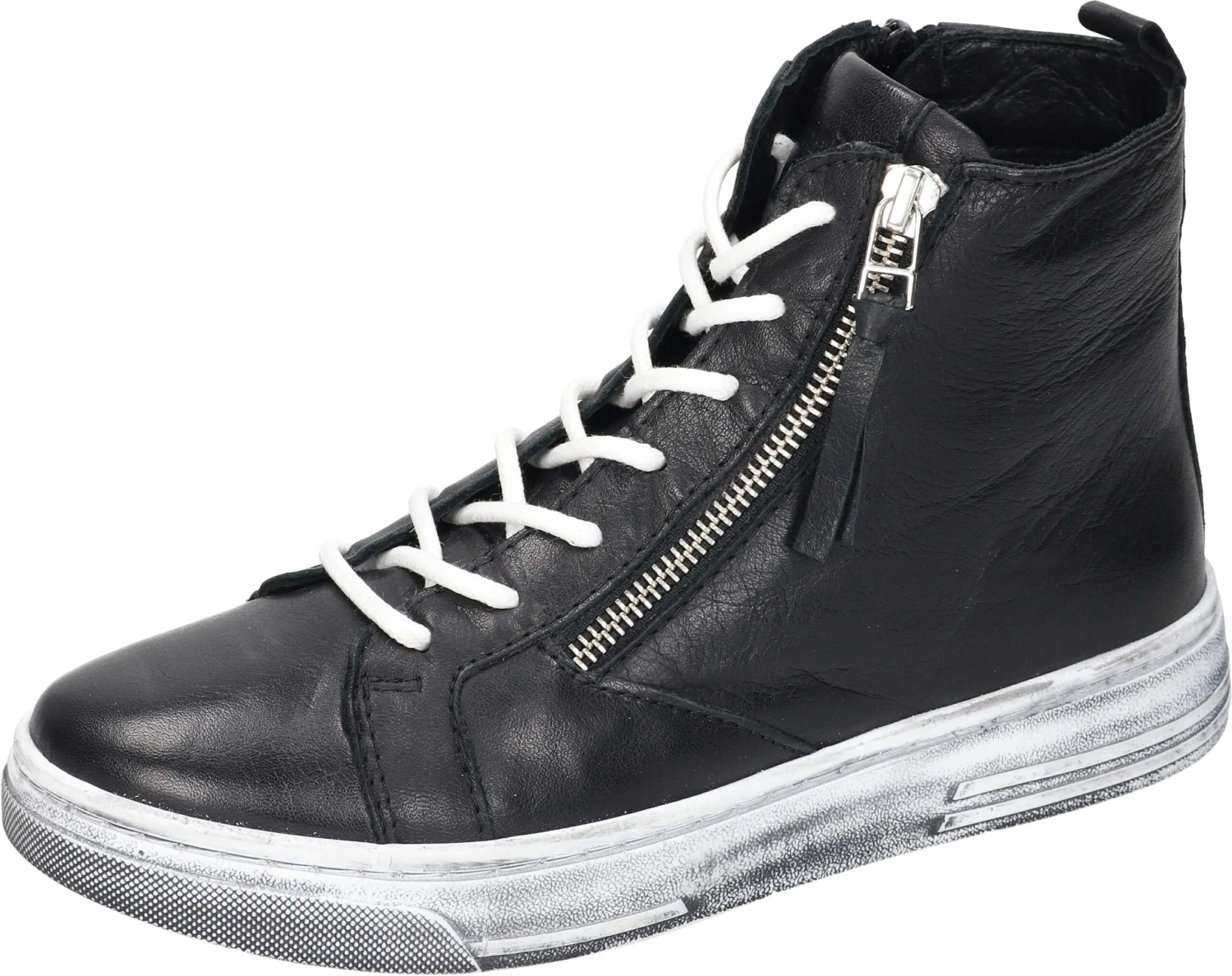 Lässige, knöchelhohe Damen Stiefeletten mit Schnürung zur Weiterverstellbarkeit und aus echtem Leder. Die helle leichte Gummilaufsohle im Used-Look und der dekorative Reißverschluss runden das Modell im High Sneaker Style gekonnt ab und verleihen einen sportlichen authentischen Look. Der Schuh verfügt über eine herausnehmbare Decksohle, wodurch das Einsetzen individueller Einlagen möglich ist.