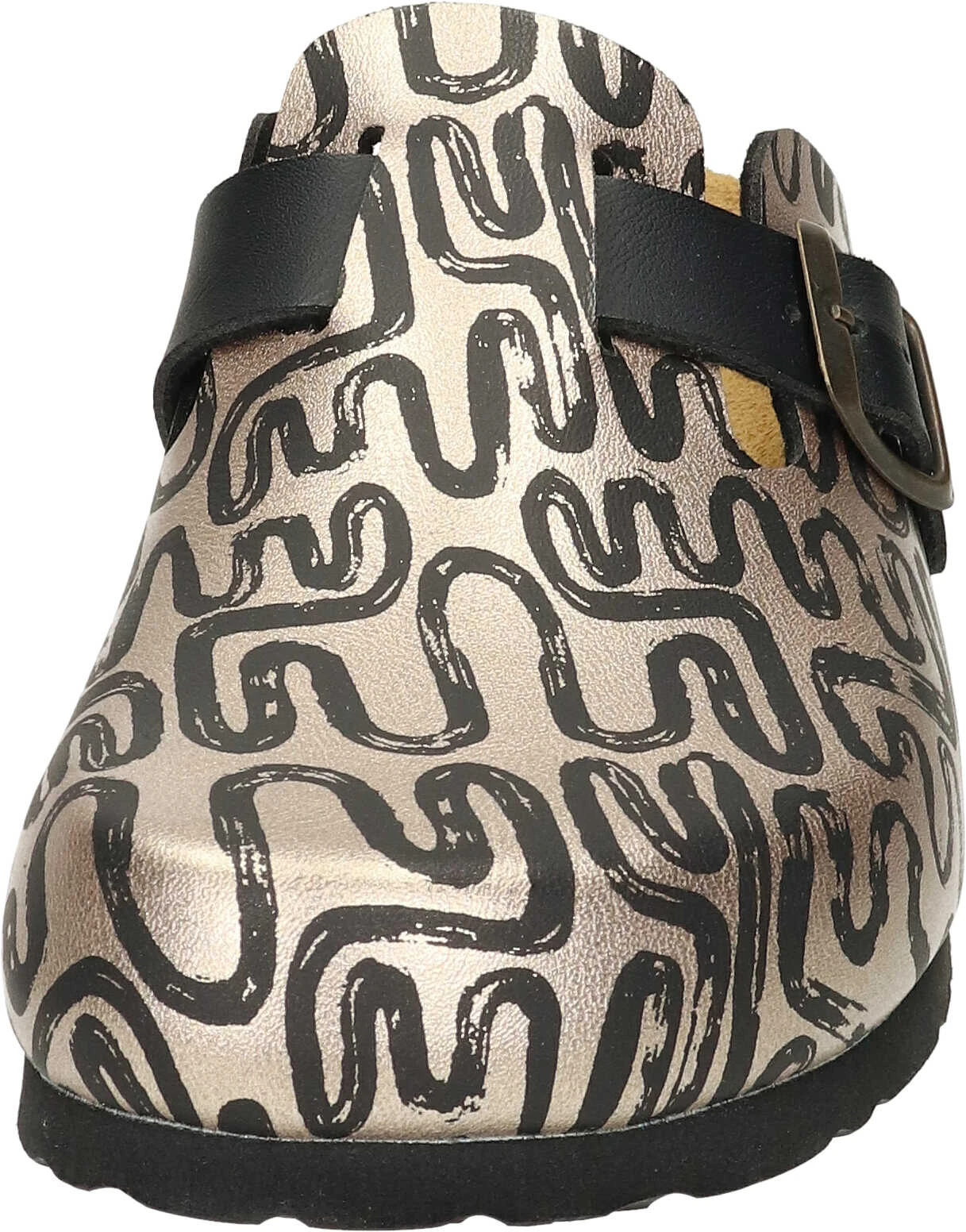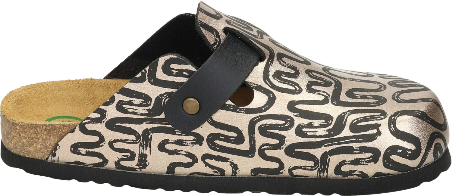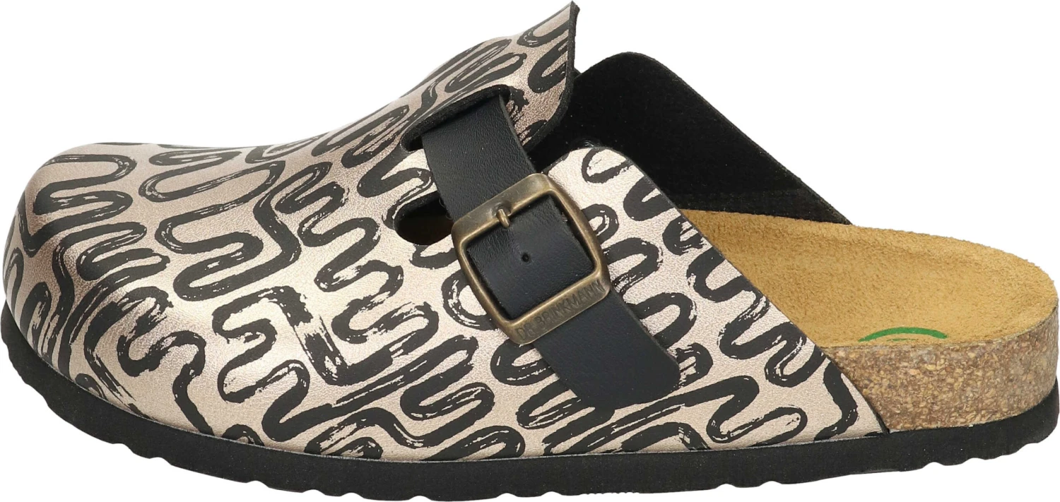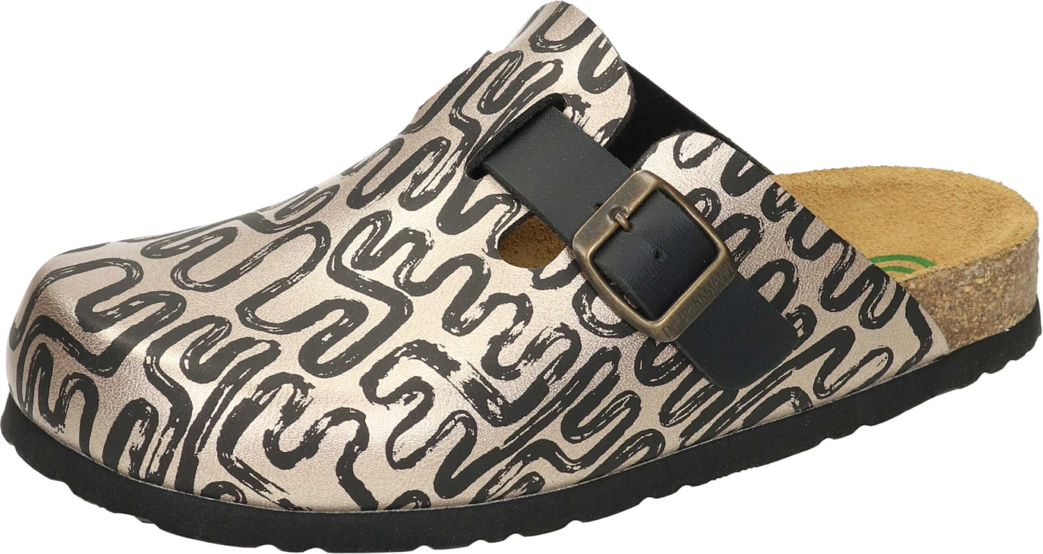 Mit unserem Damenclog Modell NERPIO in Gold sind Sie der Hingucker! Das Obermaterial aus Flor ist mit einem eleganten Muster versehen, strapazierfähig und bietet Leichtigkeit. Die Lederdecksohle und das gepolsterte Naturform-Fußbett garantieren hohen Tragekomfort. Freuen Sie sich auf ein unkompliziertes An- und Ausziehen, aufgrund des Schlupfschuh-Modells. Diese Clogs sind für Damen, die Wert auf Komfort, Stil und Eleganz legen. Setzen Sie ein modisches Statement mit Dr. Brinkmann – ob zuhause, im Garten oder in der Freizeit.