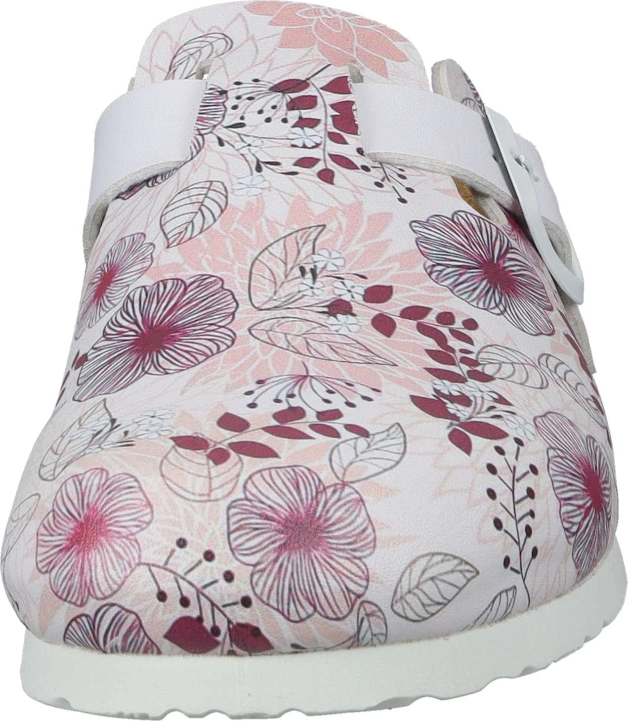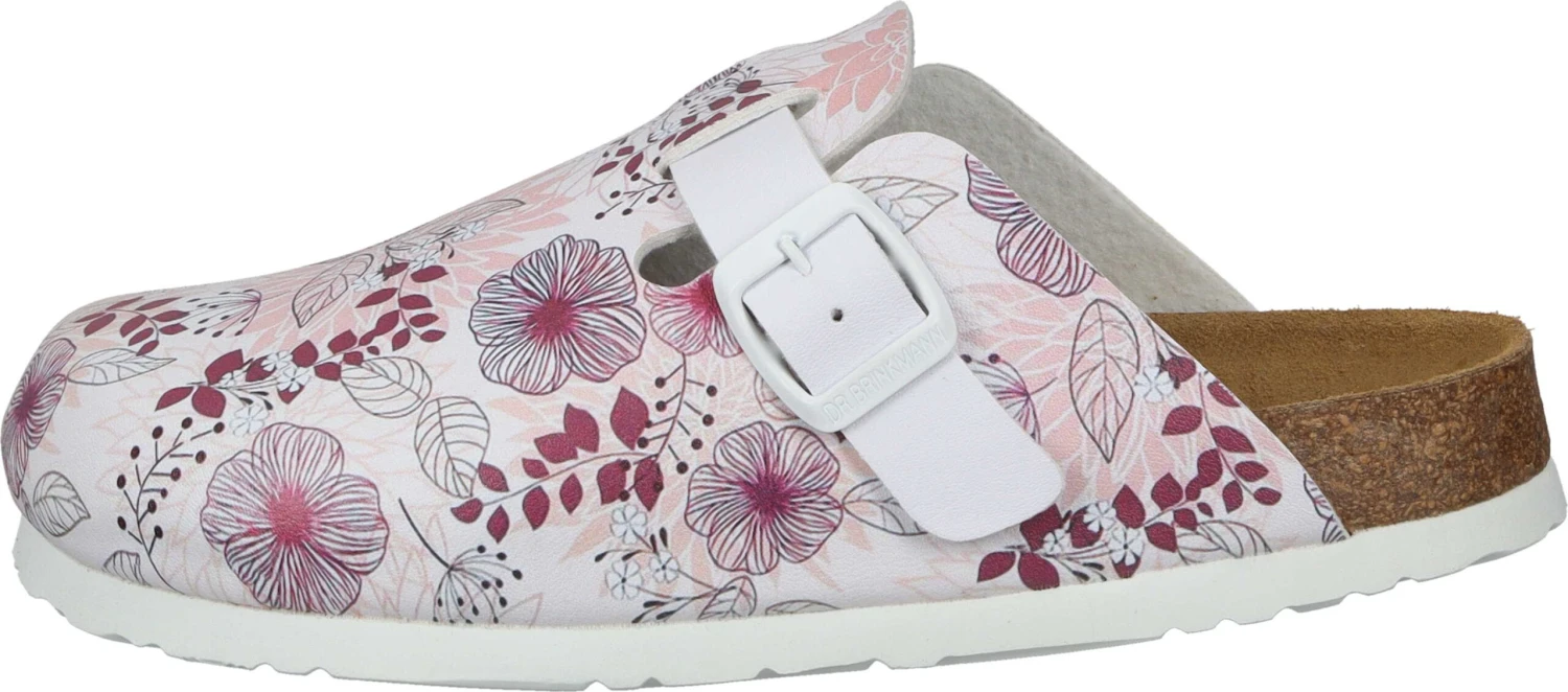 Unser Clog – Modell NERPIO in zartem rosa / weiß mit blumigen Muster bringt garantiert gute Laune in Ihr Zuhause. Das Obermaterial ist hautfreundlich, strapazierfähig und pflegeleicht und die Lederdecksohle bietet erstklassigen Tragekomfort. Das gepolsterte Fußbett ist anatomisch geformt und sorgt für einen natürlichen Gang. Die Laufsohle garantiert Leichtigkeit bei jedem Schritt. Egal ob als Hausschuh oder im Freien, diese Damen Clogs sind Ihre praktischen Alltagsbegleiter zum Hineinschlüpfen.