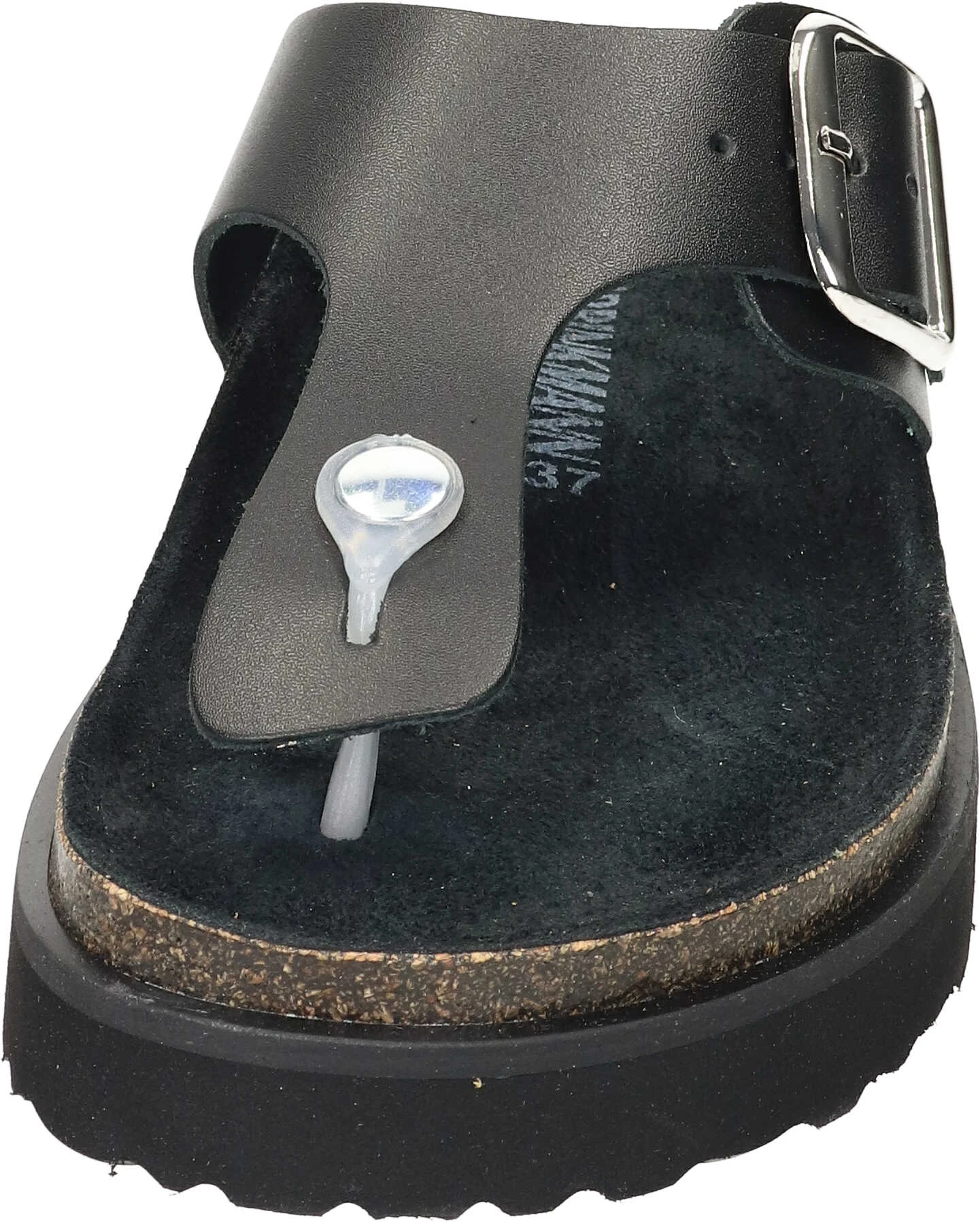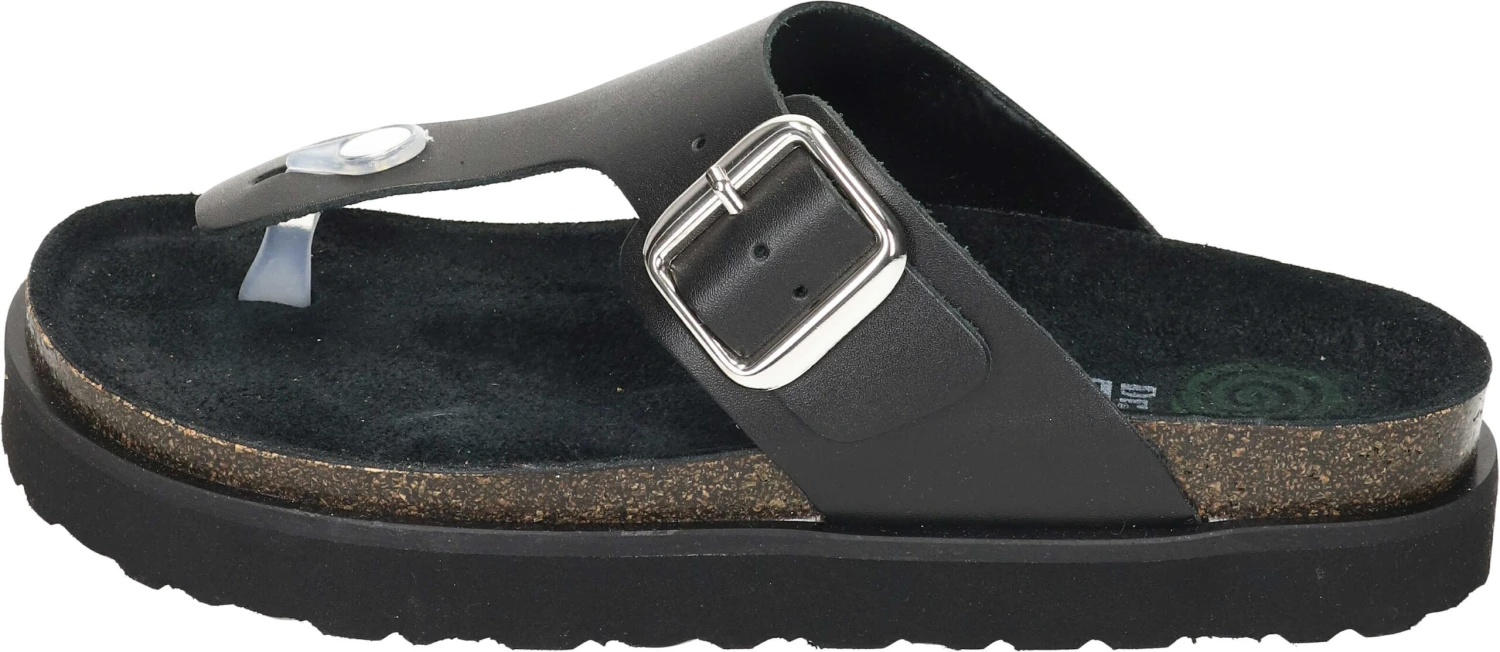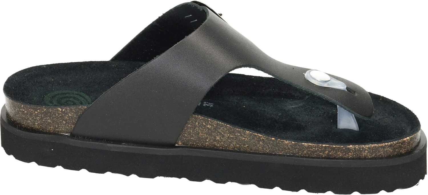 Gönnen Sie Ihren Füßen eine Portion modisch-bequeme Freiheit mit diesen puristisch anmutenden Zehengreifer-Pantoletten aus softem, schwarzem Leder. Zu den optischen Besonderheiten zählt die große, eckige Dornschnalle am Riemen. Mit ihrem silbernen Glanz wird sie zum Hingucker der sonst schlicht schwarz gehaltenen Sandale und ermöglicht zudem die individuelle Regulierung der Riemenweite. Das schrittdämpfende Kork-Fußbett wird eingerahmt von einer robusten Leichtzellsohle, die dem Schuh das gewisse topmodische Extra verleiht. Die zusätzliche Schaumpolsterung unter der schwarzen Lederdecksohle sorgt für ein unbeschreibliches Gehgefühl. Sichern Sie sich diese Zehentrenner von Dr. Brinkmann und bringen Sie Ihr Outfit modisch auf den Punkt.