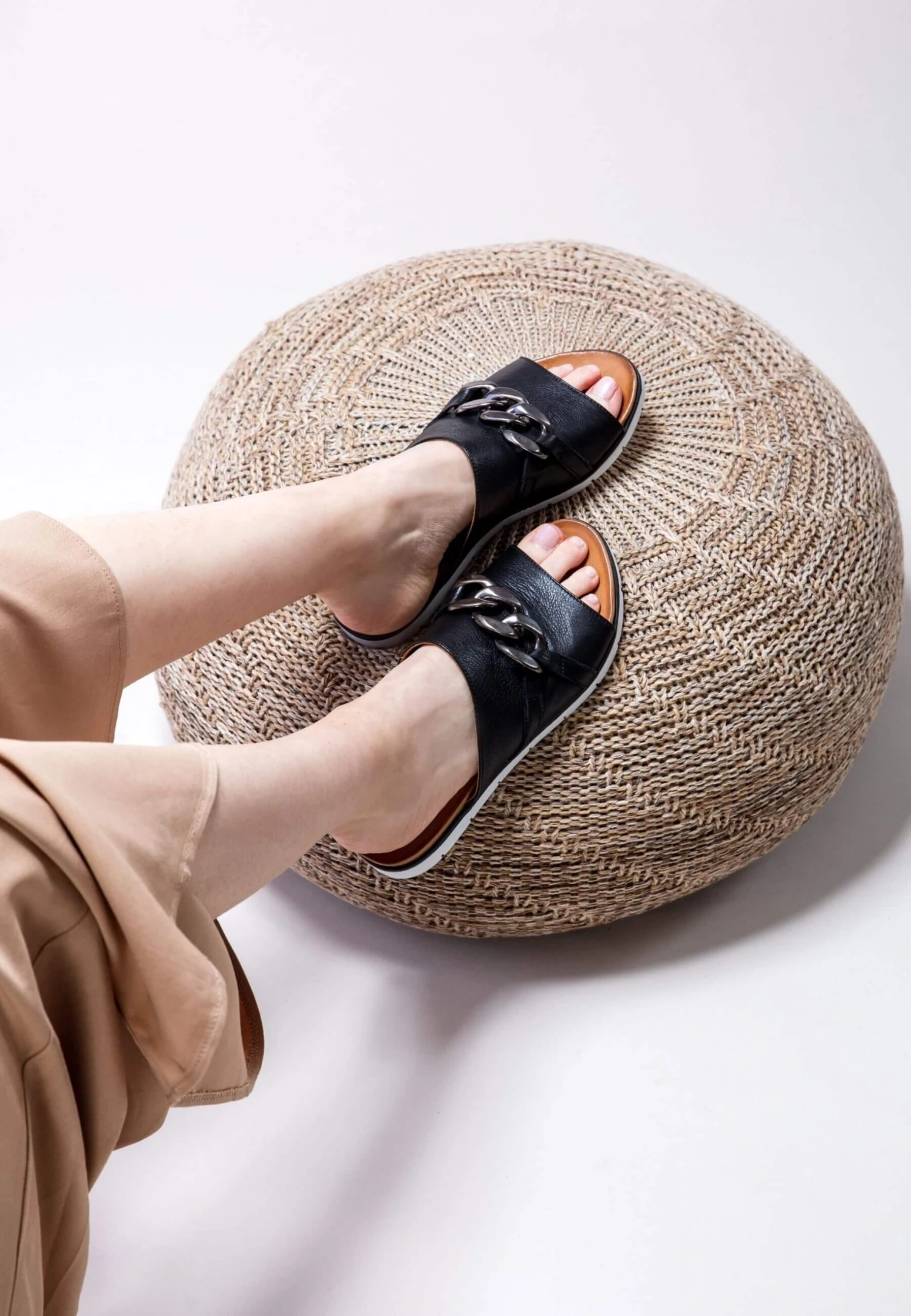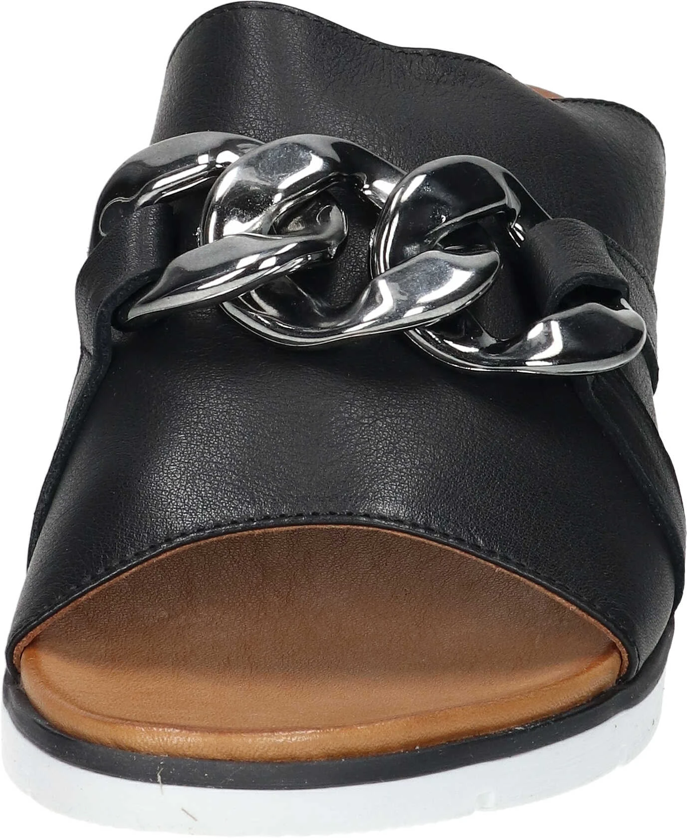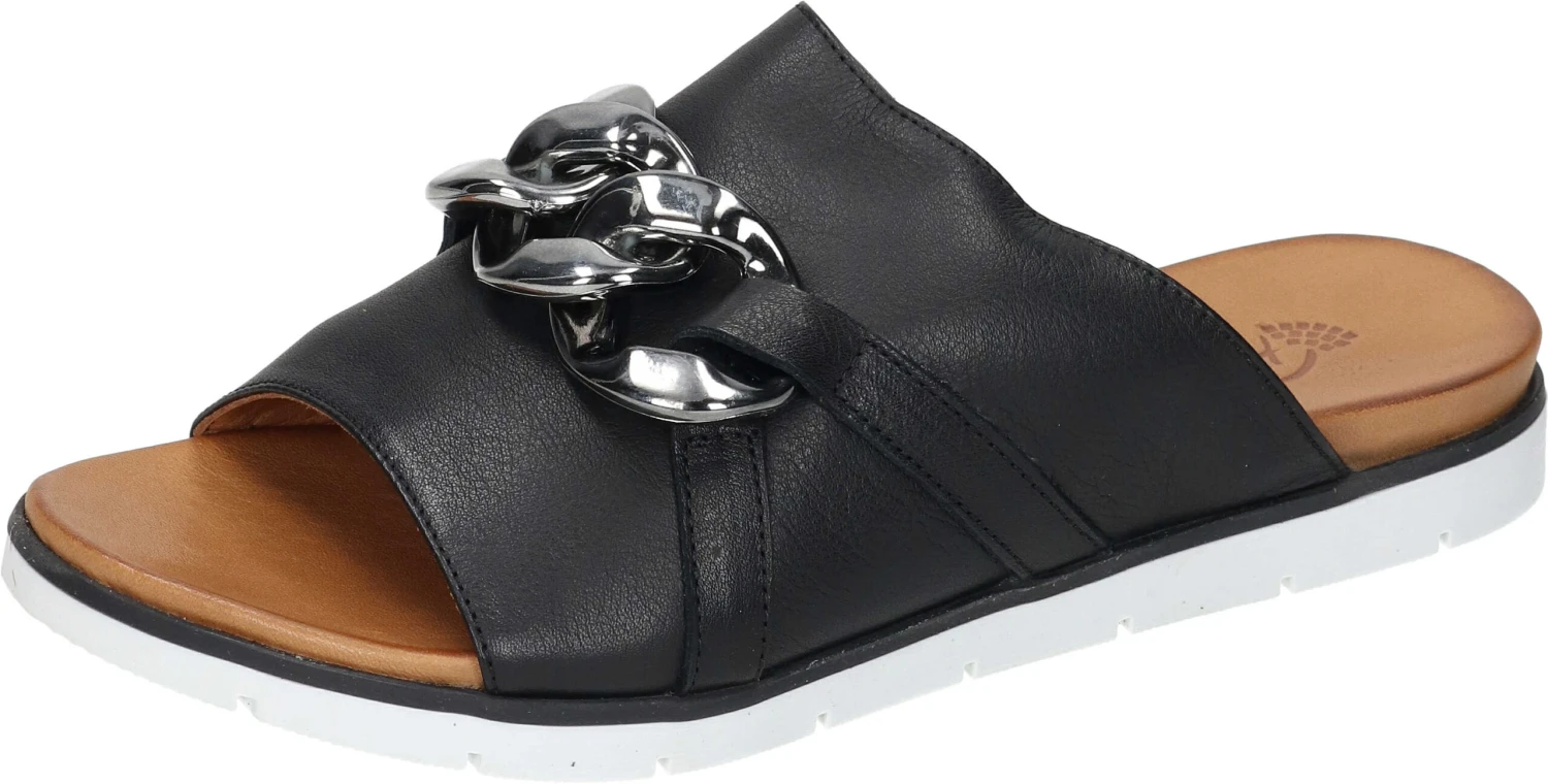Diese modische Pantolette von Piazza zeigt sich mit einer großen silbernen Kette, die uns an Statement-Schmuck erinnert. Das Paar besteht aus wunderbar weichem Leder und hat eine bequeme, gepolsterte Lederdecksohle. Durch den Gummizug am Obermaterial liegt der Schuh gut am Fuß an. Das Material der Sohle hat die Eigenschaft rutschfest zu sein, mit einem geringen Abrieb und hervorragender Trittfestigkeit. Getragen werden kann der Schuh sowohl zu schicken Kleidern, als auch zu lässigen Jeans.