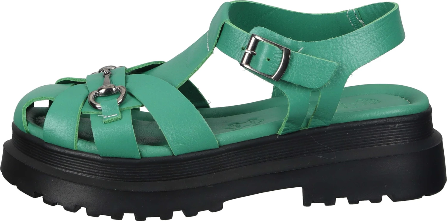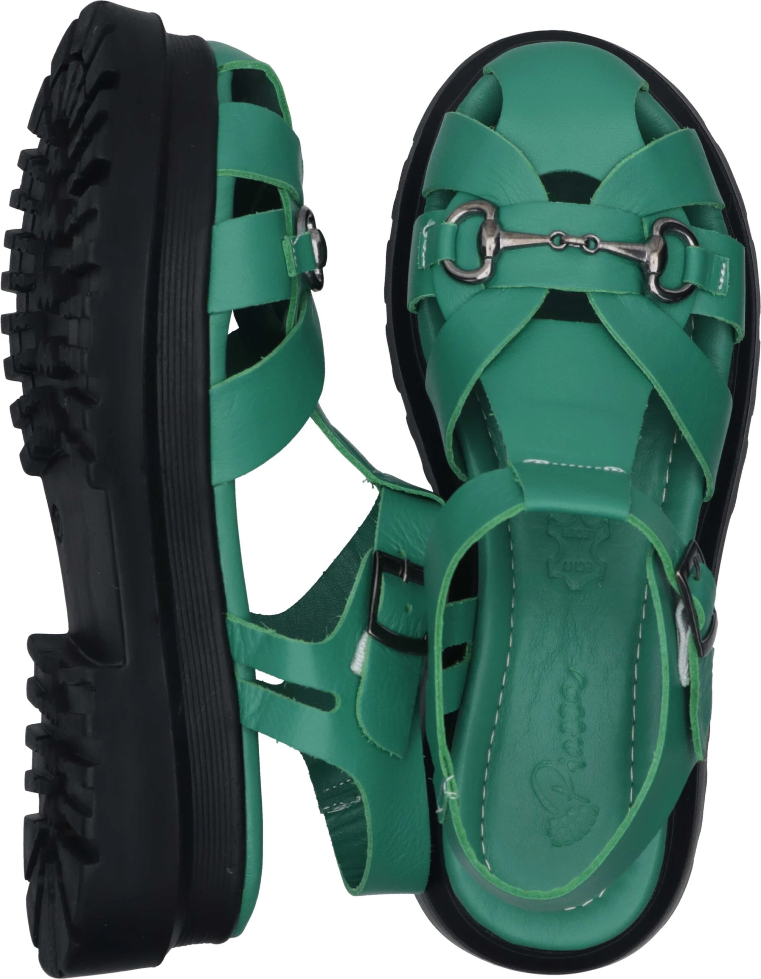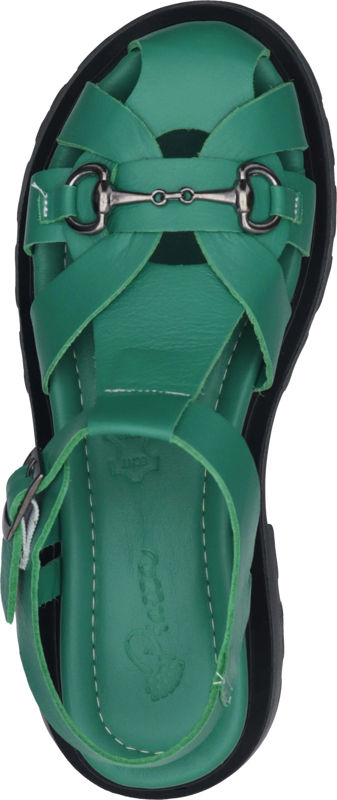 PIAZZA präsentiert hier diese modischen Damen Plateau-Sandalen in Grün. Das Leder ist handschuhweich gearbeitet und überzeugt durch Qualität und Langlebigkeit. Das schmückende, silberfarbene Detail auf dem Schuhrücken und die raffinierten Riemen bilden eine mondäne Silhouette. Der vordere Bereich der Sandale ist halb geschlossen, was die Zehenpartie schützt. Guten Halt und eine angenehme Passform bietet zudem der seitliche Verschluss. Markant profiliert verspricht die leichte Sohle mit dem gepolsterten Lederfußbett höchsten Tragekomfort.